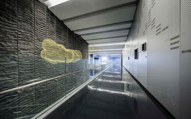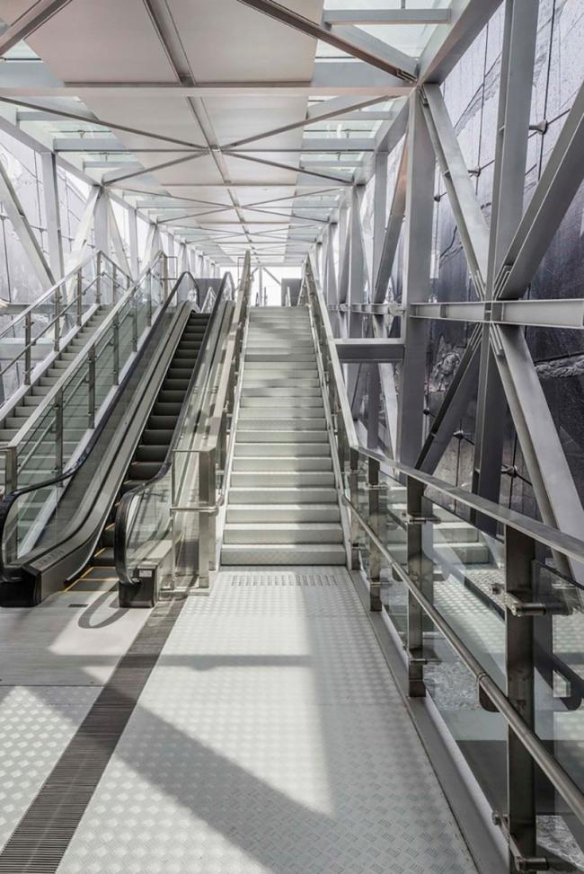 巧妙地运用乘客的高铁体验,透过动线的设计让访客先穿越方形的玻璃通道,在频繁经过的高铁车次中,让每个访客都能穿梭「现代」,眺望这趟最新、最快的交通技术和科技园区设施,仿佛正在见证未来。行过观景高点再以逆时钟方向下探历史的旅程,又仿佛考古挖掘的过程,同一个地点曾经文明涨退交迭,藉由身体的移动与五感来亲(BIM工程师)身体会。