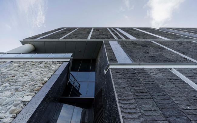 建筑外墙以粗犷火山岩为主,夜里光线隐隐的渗透,对照粗糙的石材质感诉说神秘的诗意。