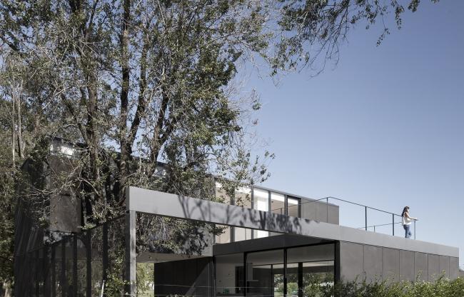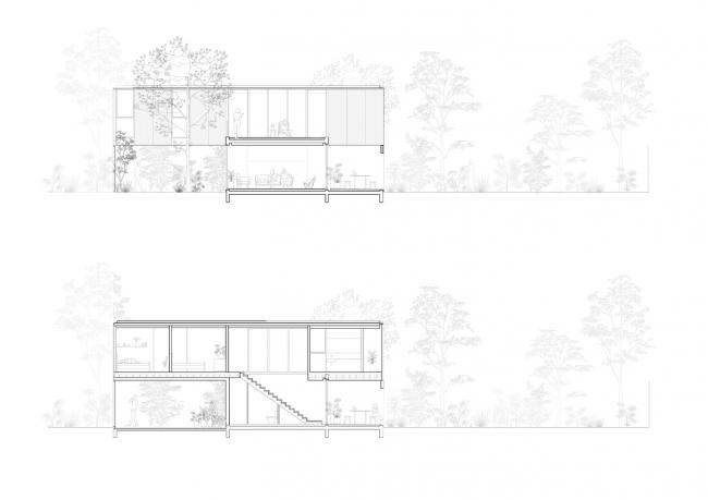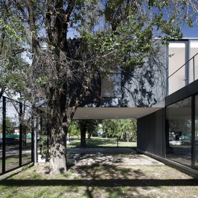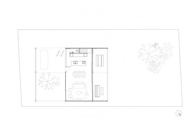 为了从外部获得减少的视觉效果,这座房子从人行道上退了下来,形成了一个像入口一样的庭院,里面保留了一棵茂盛的大树。该进入空间由一个透明网格金属网分隔,允许植被生长并保证隐私。连接前后花园的走廊和客厅位于庭院和后花园之间,将建筑和景观融为一体。