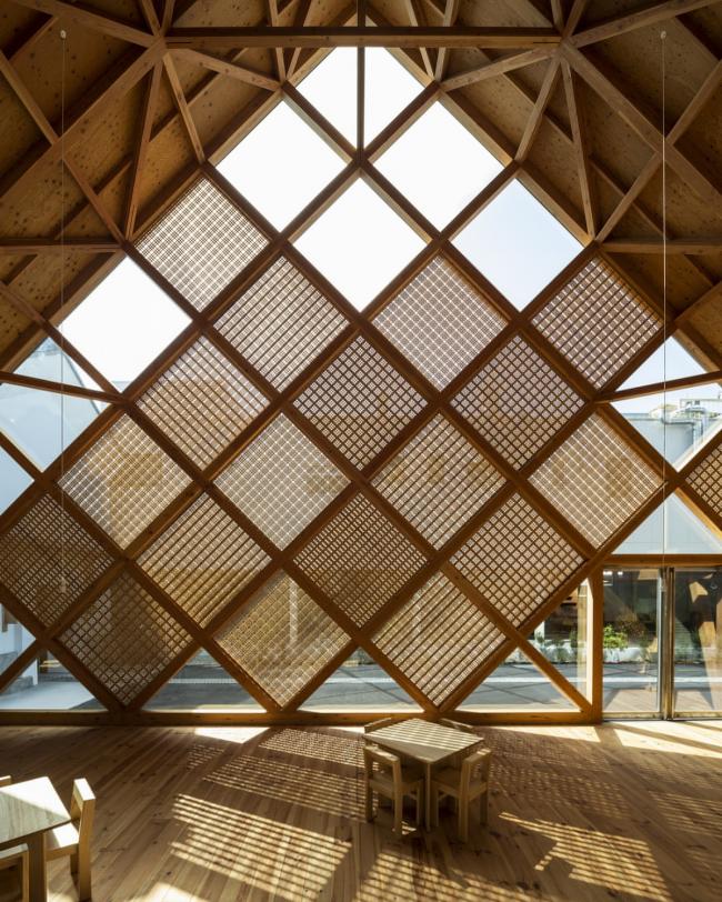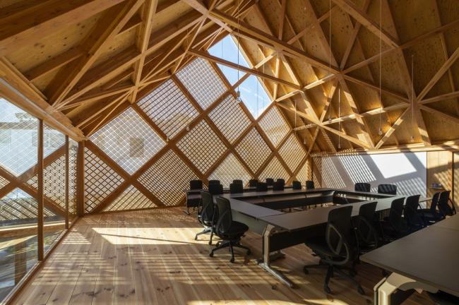 木构建筑采用的既是最古老也是最先进的建筑技术。木结构的真正价值在于从结构到固定部件之间的连续性。通过这种方式,新商会将会是一个真正的木构建筑,由工匠建造而成。真正的木结构建筑不会过时,随着时间的推移,它会变得愈发成熟、美观并具有特色。我们希望在未来的几个世纪里,这座建筑能成为富冈市的地标,与丝绸厂并立。从结构到遮阳雨棚,对角网格图案重复出现,甚至书架也是由同样的图案构成的。最初,这种图案形状是从建筑屋脊形式中衍生出来的。