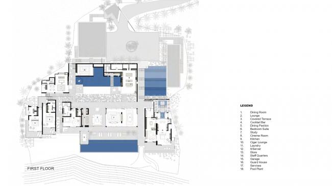 一个巨大的棕榈树环绕的入口庭院在宾客到来时营造出一种舞台场景的效果,巨大的楼梯漂浮在瀑布之上。由整块石材覆盖的墙壁在宾客进入住宅时提供了独特的体验。中央的入口可以作为抵达住宅时的聚集区。休(BIM建筑)息室、餐厅和非露天式的露台形成了住宅的核心,由内而外进行辐射,使得用于栽种植被的庭院和景观互相呼应,与西边的广阔庭院形成了对比。