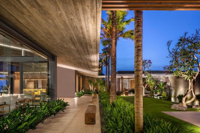 建筑和外部庭院是相互交织的,意味着住客会持续地在建筑和景观之间步行穿梭,以形成强大的空间联系感。融合在一起的室内外生活方式与巴厘岛的气候相呼应。户外空间、庭院以及亭台楼阁都提供了不同程度的室外体验。多孔的设计也使得海洋方向来的自然风能够与建筑内部的空气形成空气循环。而在较为炎热的环境下则可以选择完全封闭的空调休息室和用餐区。