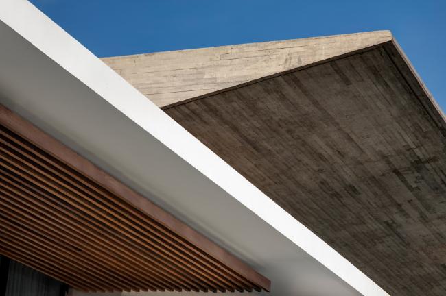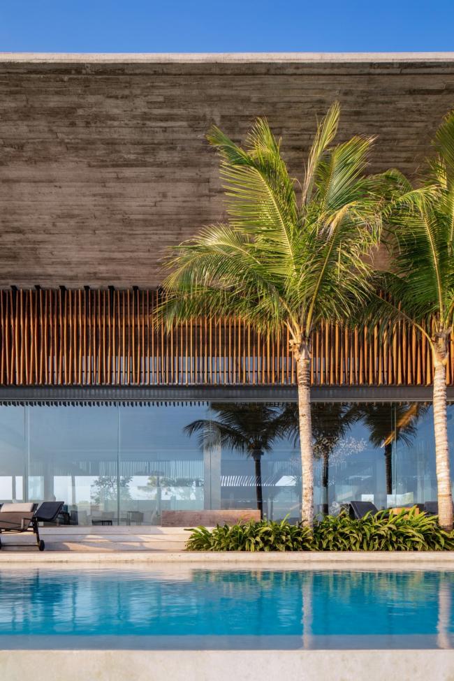 在主要生活区,巴厘岛建筑特有的当地展馆的木结构幕墙被重新诠释,采用了玻璃幕墙作为替代品,当地轻质木屋顶被重新设计为由板纹混凝土制作而成悬浮的混凝土屋顶。建筑师针对当地普遍存在的木结构进行优化,以满足项目规模的需求。屋顶引人注目的地方在于斜坡,其倾斜的方向与度假村的东西向相呼应,使得早晨的光线足以欣赏东方的海景,同时有效遮挡了来自西方午后的强烈阳光。