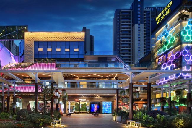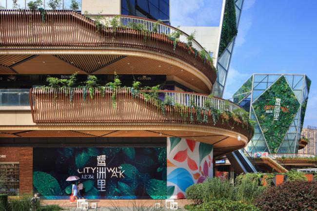 开放式的布置方式、差异化的业态补充、森林主题的景观营造、游玩式的创新体验以及绿色生态的植物立面,使得项目的商业形态与众不同,形成了极具“新森林”风格的共享体验式街区,体现出都市休闲的乐活氛围。
