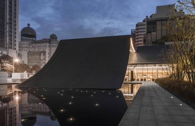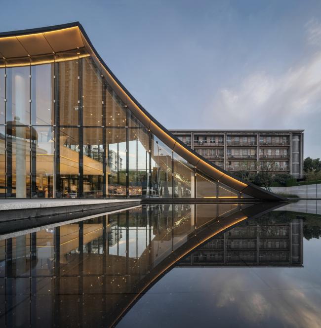 入口隐于展厅的非临街面,徐徐绕水池折返入内,临水而望,渐入佳境。顺纹铝镁锰屋面板增加了线条的灵动轻盈,与幕墙、水镜共同营造出宁静致远的超然气质。