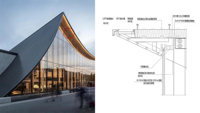 ▲ 屋面与玻璃幕墙、室内天花节点