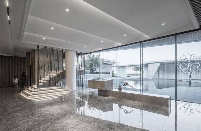 建筑与庭院的渐次递进,使得空间的层次得到了丰富,通高的玻璃面将室内外融为一体。人在建筑与庭院中漫步游移,也成为别人眼中的风景。