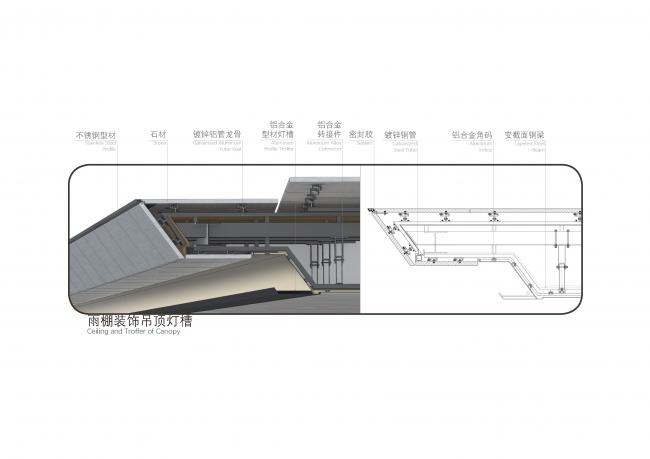 入口石材雨棚尺寸巨大而仅有一侧落地,而同时又要保证感受上的轻薄。设计上采用收分的手法,主体尺寸适当放大以留够结构空间,而外侧石材边缘仍得以呈现较为轻薄的尺度。内侧以细密的铝板格栅作为饰面从而提升近人尺度的精致感。在此过程中,方案设计师与钢结构及幕墙专业工程师一起,反复讨论钢梁尺寸与外包尺寸,每一个尺寸几乎都是合理范围内的极限。