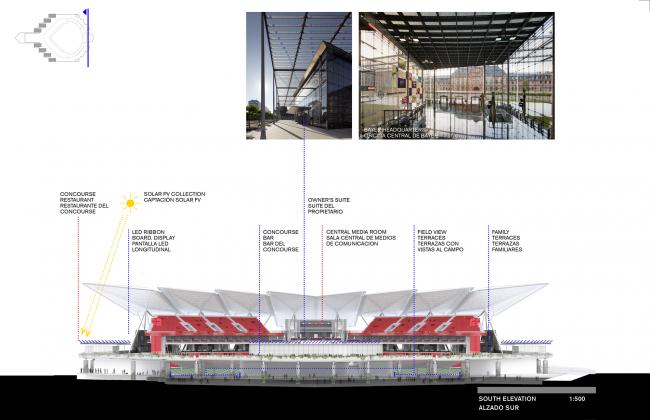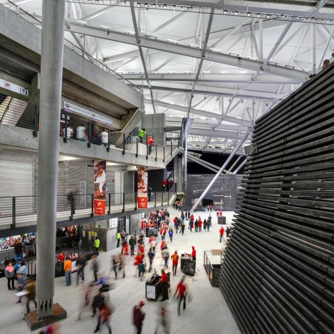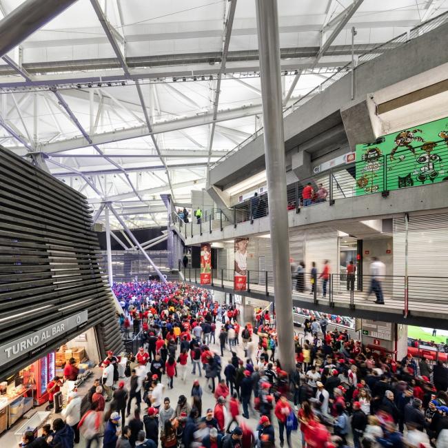 如今的体育场本身展现出的露天圆形剧场的感觉很大程度上是因为其“浮动”屋顶的设计,其覆盖令人印象深刻的11,500个有顶座位,同时外场的还有8,500个额外座位。所有这些都旨在能向观众们提供球赛的绝美视角。在将俯瞰全场的贵宾房间合并的同时,还为周围社区专门预留了一定数量的低成本座位。此外,一个公共广场被设计成围绕体育场的形式,旨再为当地社区提供一种通过全年开放市场来获得额外收入同时提供另一种使人们相聚的方式。
