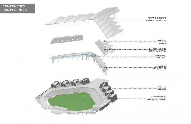 巨大而轻巧的结构由包裹于聚四氟乙烯纺织材料中的钢架组成,并且对光加以运用。为了安装它,启用了世界上最大的起重机用来将巨大的桁架结构提升到位,而数字扫描技术则确保了其安装位置的精确对准。六个被当地火山岩建材包裹的截断金字塔状体量构成了建筑的底部,同时在顶部创造出了户外露台,并设有食品摊位及远离竞技场的社交场所。这些体量的形态及物质性能勾起记忆中古代中美洲寺庙的印象向人民提醒着这个国家丰富的历史,并通过提供一个令人惊叹的入口完美地结合了仪式感和创新性。