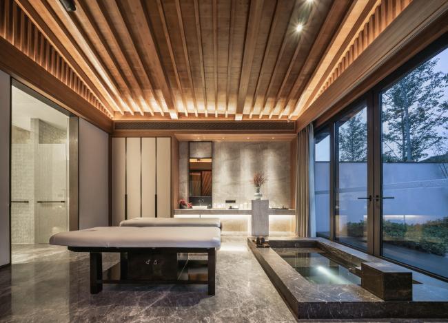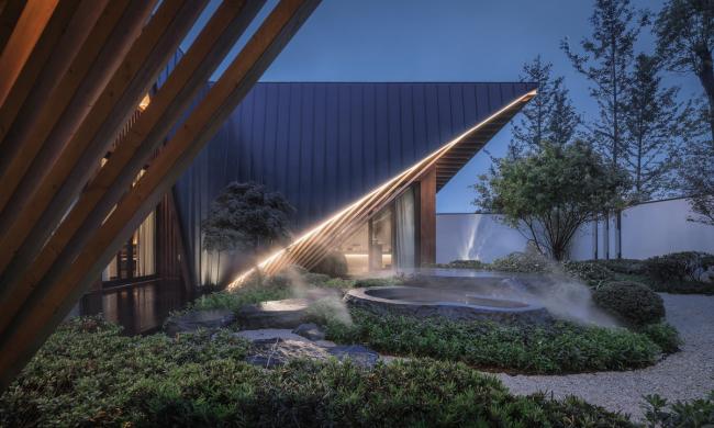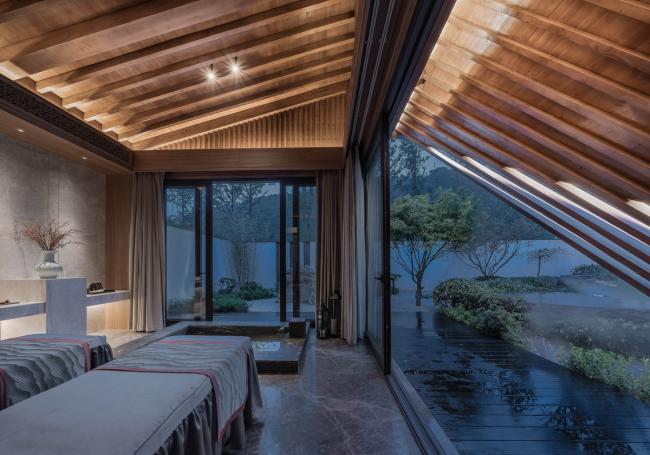 整个建筑空间层层渐变,屋顶高度根据功能空间的不同而变换,SPA作为最为私密的空间,屋顶落低,但动与静互为补充,相辅相成。
