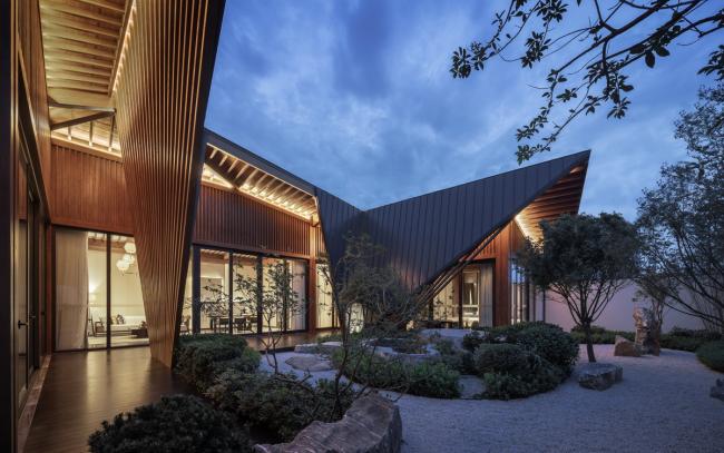 “和、敬、清、寂”是东方文化的精神内涵,温泉会馆延续了螺洲传统的建筑风格,以古镇为肌理,采用院落形式,对称式布局。用现代手法突破传统的四坡屋面,以折线打造五坡,开口折向屋顶落于地面,形成廊道。水疗SPA与餐厅的屋顶则沿袭古建中的大挑檐,却以更为简单朴素的方式呈现。