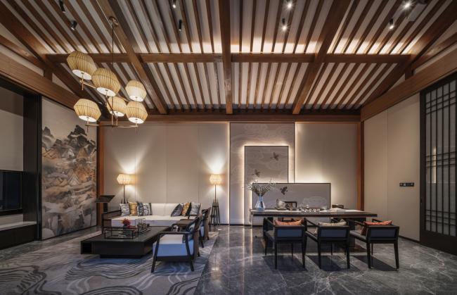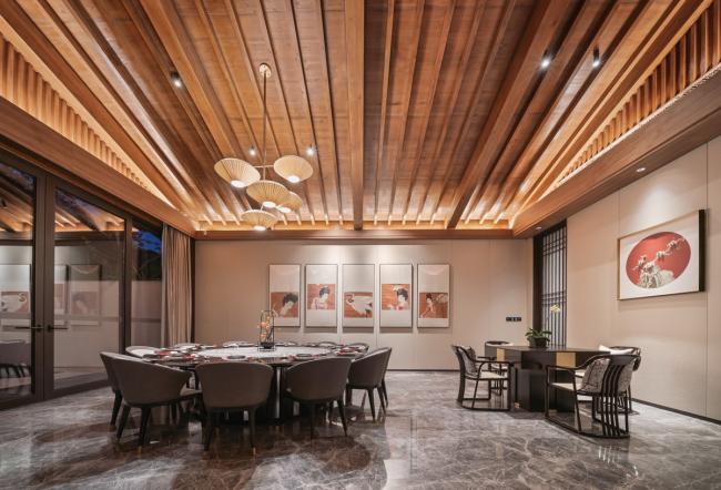 用玻璃与木格栅分割室内外空间,引导视线,借以北侧远山,分别形成三面框景。无声、有光、有影,建筑元素越是接近世界的本原,人越能与空间产生共鸣,皆在营造闹中取静的空间氛围。