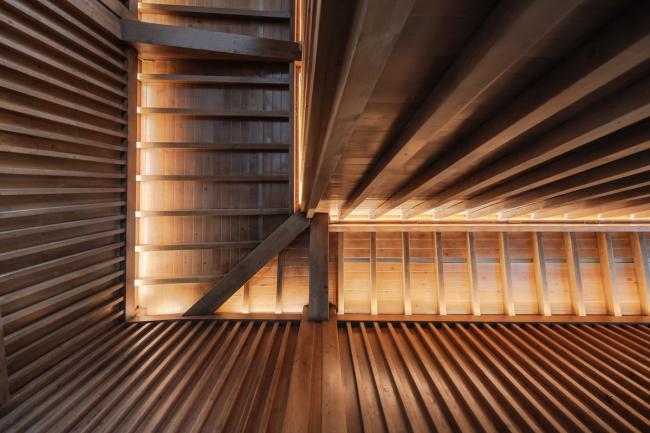 设计师充分尊重和保持材料的本质,利用木材这种天然材料,保证了建筑的“原色性”。外露的胶合木结构,以素面处理,表现出清晰的木质纹路及柔和自然的光泽。小巧的木构件尺寸不同于其他的大型木构项目,将材料“粒子化”的手法,细化成模数作为建筑的组成。