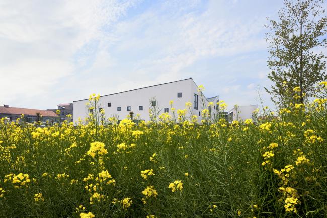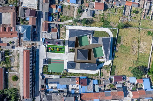 我们在北沙、硕集两所幼儿园的设计上运用了相似的手法,又因地制宜,各具考量。与北沙村坐落于水乡风景间、模拟村庄形态的幼儿园截然不同,硕集社区这座幼儿园,位于欣欣向荣的县城核心区,被密集的商业街区、事业单位、乡镇企业,繁忙的乡镇公路和堆满废弃物的待建空地环绕,周边不算开阔,景致也乏善可陈。针对这种现状,我们决定制造一个“群山环抱”的“谷地”:以多层建筑三面围合出一个内向空间,为孩子们在园内生活、玩耍和学习时,阻隔来自外界的大部分嘈杂;同时,仍沿用组团形式,适度分解幼儿园的总建筑体量,将尺度降到不至于让孩子感到压迫的程度。