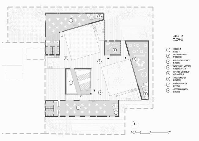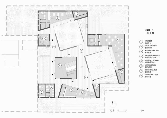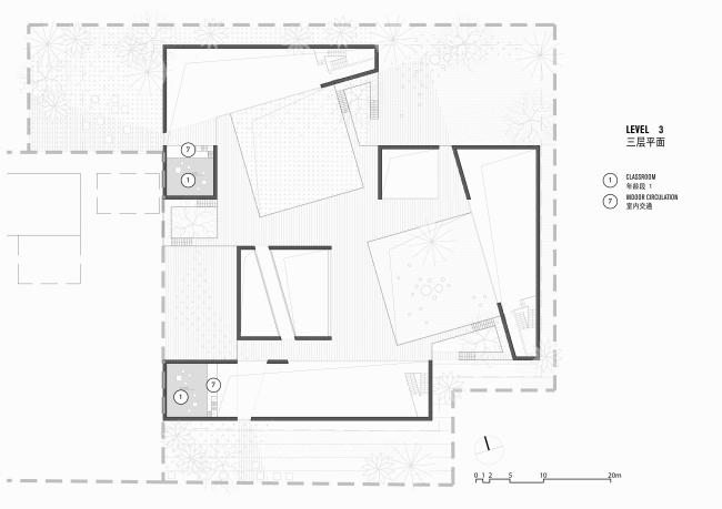 在布局上,“山谷”四周的建筑容纳了不同功能,但各自独立,我们特意将大部分交通空间挪到室外共享的大院里。这样,孩子们在进出各个学习、娱乐或生活空间时,总要经过中庭,大大增加了他们进行户外活动和自由交流的机会。