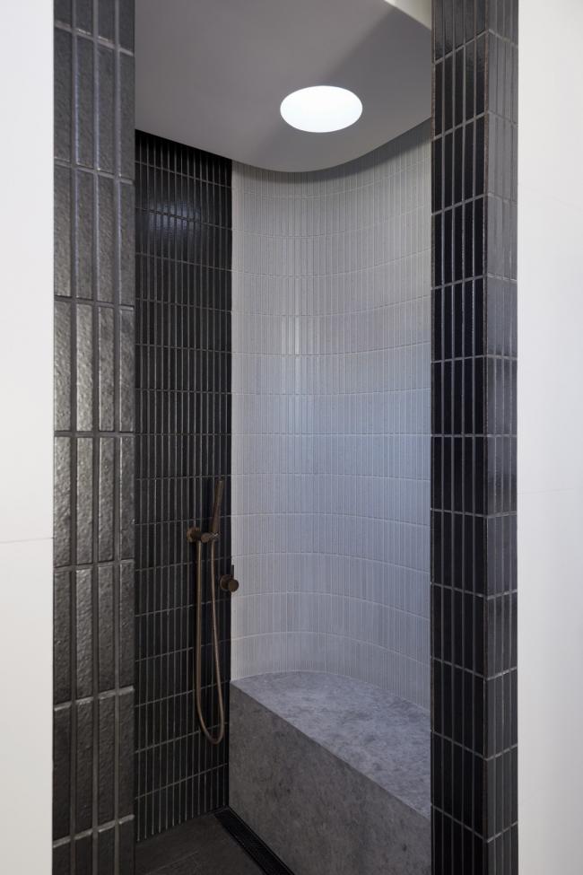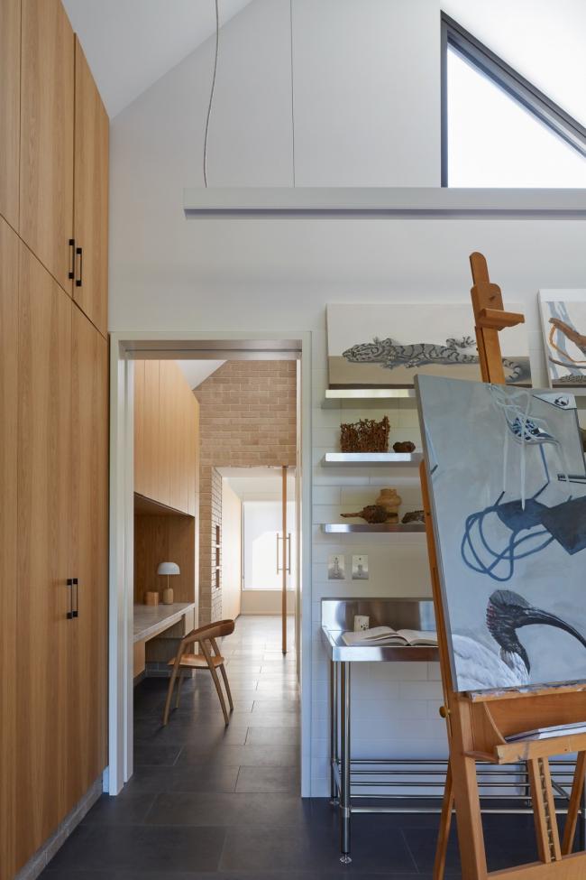 一个兼顾美学与声学的私人音乐室提供极佳的隔音,将音乐包裹环绕同时也有搭配了宽大坚固的书架。在音乐室顶上,艺术工作室却大为不同地与外界融合。敞开的阳台延伸向街道,一块镶板窗却俏皮地将露台与室内生活空间联结在一起。