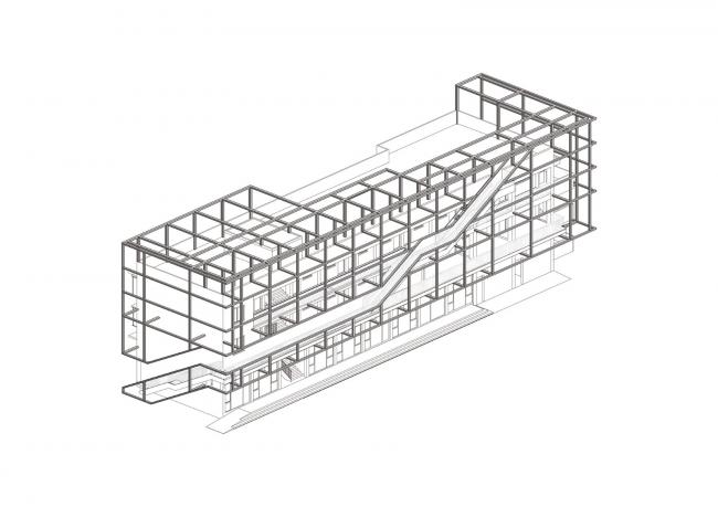 除此之外,设计在建筑里引入一条公共流线,通过楼梯串联了一层北面食堂出口、二层、三层和屋顶空间,使不同标高的交流场所建立更紧密的联系。新加的幕墙表皮也形成一条长条形开口对应着这条公共流线,使得内部空间与外立面形式统一。人在行走过程中也能透过开阔的开口观看外部的绿树与城市。