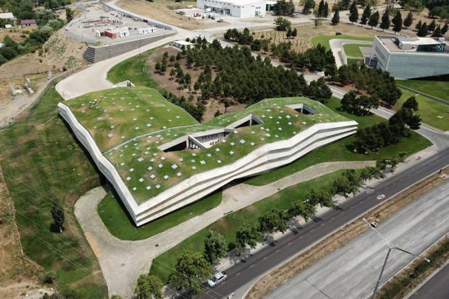 现浇混凝土折叠状的外立面为双层保温墙,具有良好的抗老化性能。3680平方米的绿色屋顶作为屋顶隔热的额外热障。屋顶上种植着和基地周围一样的植被和野生的草和植物,以让建筑融入环境,这样做也减少了建筑的维护需要。