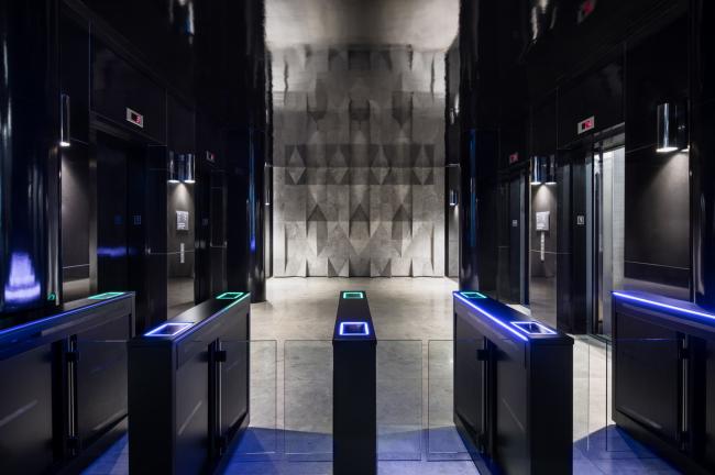 大堂里装饰着艺术家 Andrew Antonaccio 用苔藓制作的曼哈顿大桥艺术墙,面积约为366 x 396 厘米。电梯间有着一面约为518 x 396 厘米的混凝土背景墙,其图案形似该建筑外立面的晶体结构。