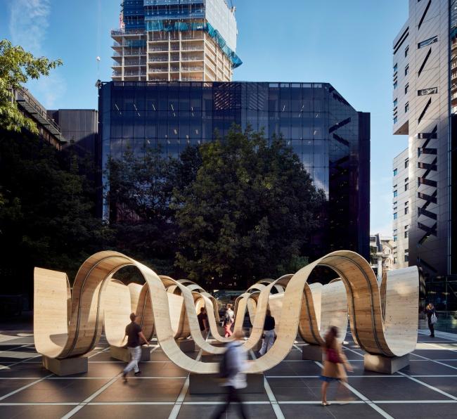 考克斯奇所设计的这个装置,将是英国土地委员会迄今为止最具抱负的一个项目。通过与ARUP和高端室内设计公司White & White的合作,考克斯奇利用脚手架木板的重新使用,实现了伦敦Broadgate地区的惊艳转型。“装置中每一部分的造型和功能都是根据其所处的环境量身定制的。升起的圆弧,不光可被用作背靠或歇脚休憩之所,还可实现人们的遮阳和通行所需,丝毫不会占据甚至阻碍装置所处的广场空间。从这个角度来看,这个装置可谓是游走于艺术和手工艺品这两大领域之间。”考克斯奇这样说道。