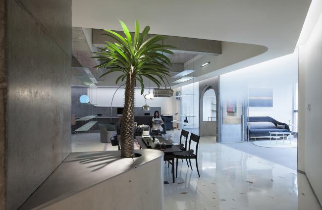 休憩区临近弧形工作台,通过悬挂的玻璃层板分隔。没有明确的界线来划分工作与休闲,正如我们所希望的,一切情绪与需求来自于自身的判断和坚持。