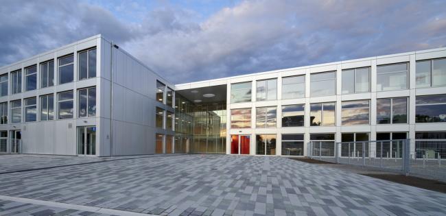 学校建筑为南北方向,修长的折线结构,教室外墙大多为东西朝向,行政和专科教室分别安排在朝北和朝南的区域。外立面的设计反映了内部空间的使用,所有可用的空间均由垂直或者水平分科的大型玻璃外墙分隔。走廊采用了完全透明的玻璃幕墙,所有的玻璃表面,除了朝北的立面以外全部配备了垂直的遮阳装置,在不透明的外立面覆盖了大型的铝板。屋顶绿化广泛,雨水管道均铺在立面前,使得排查的工作很容易进行。