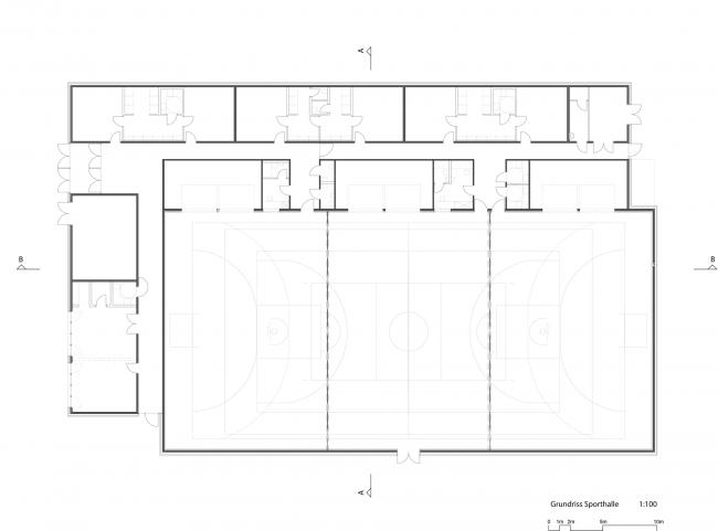 学校建筑通过中央入口区 – 大厅进入。通过大厅的五个楼梯间和一个开放式楼梯可以垂直进入建筑物。学校共有32个不同大小的教室。底楼设有一间可延展的大型多功能厅,相邻的厨房和食品柜台也可作为用餐室。专业的教室,行政房间以及工作和储藏室为学校要求的空间。大厅是学校的心脏,是大家共同聚会场所。所有楼层均位于建筑物中间,连接的方式非常清楚明了。另外五个楼梯间为垂直通道,同时可以帮助大家在需要的时候轻松逃离建筑物。这些楼梯间旁边是必要的辅助和技术室。