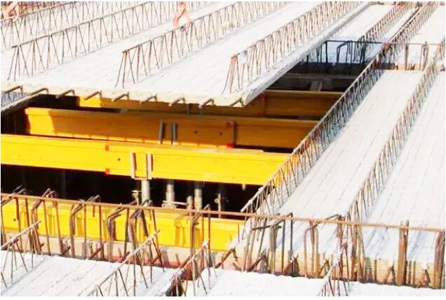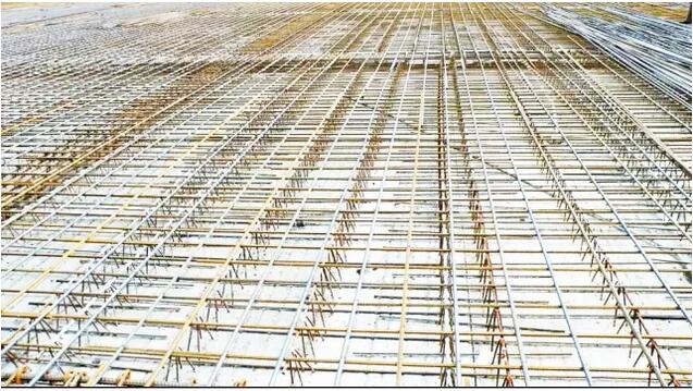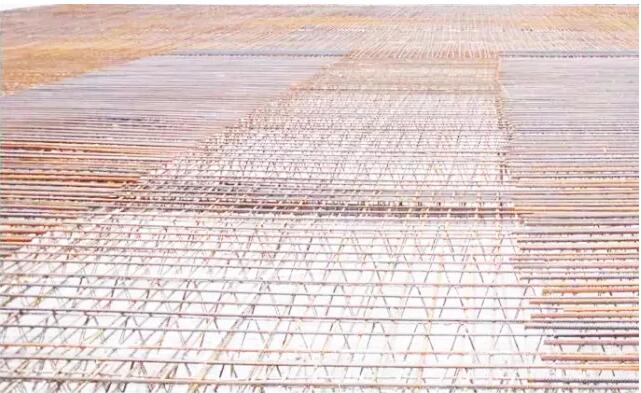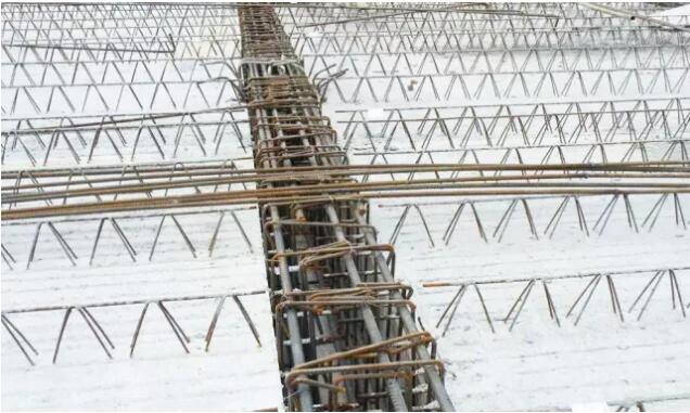 楼板上层钢筋应置于格构梁上弦钢筋上,与格构梁绑扎固定,以防止偏移和混凝土浇筑时上浮。
