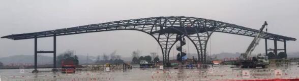 长沙黄花综合保税区位于湖南省长沙市黄花机场附近。北卡口为其“门户”工程,造型(一体化装修)似“飞机”。上部主要采用单层网壳结构形式,网壳形状为双曲拱形,连接节点为相贯焊接节点。上部网壳“两翼”搭设在下部两侧箱型墩柱上,截面形式为400*16,网壳“中部”设置为观光钢平台,观光钢平台下部设置旋转钢楼梯。北卡口高度约14m,钢网壳主要截面形式为Φ400*20、Φ273*16、Φ159*10、Φ102*7;材质均为Q345B。