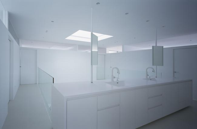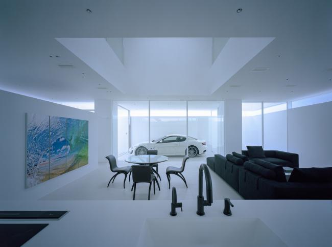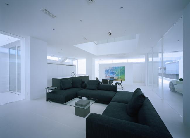 这座住宅位于高松市中心,是一对拥有一个孩子的夫妇的家。这对夫妇要求房子尽可能完全占据场地,要确保隐私,还要有一个内置车库以展示他们的小汽车,并且要采用混凝土结构,墙面简洁干净,而不是具有木材和其他材质纹理的室内效果。我们提出一种方案以回应业主的需求,即将客厅、餐厅和厨房空间置于场地的中心,其他的空间围绕着它们展开至整座房子。