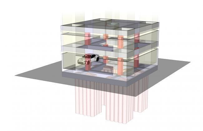 该设计也显著地节约了建造成本。建筑下方的地面相当柔软。如果采用普通板式基础,则可能会需要广泛的地基稳定性。然而,在我们的设计里,只需在四根柱子下方叠放,则可将地基稳定成本降低至板式基础的四分之一。