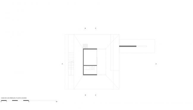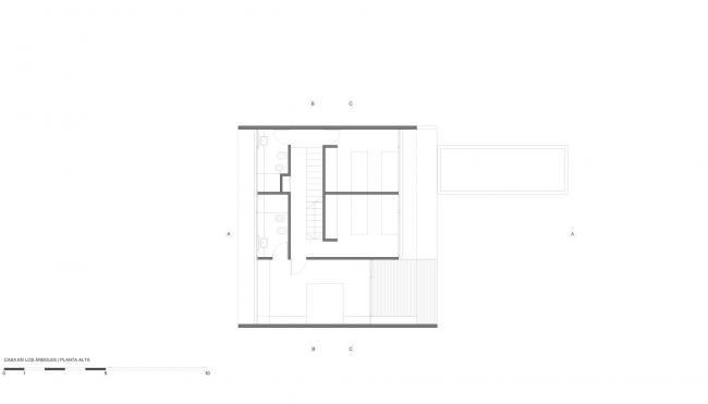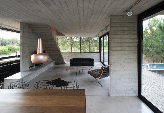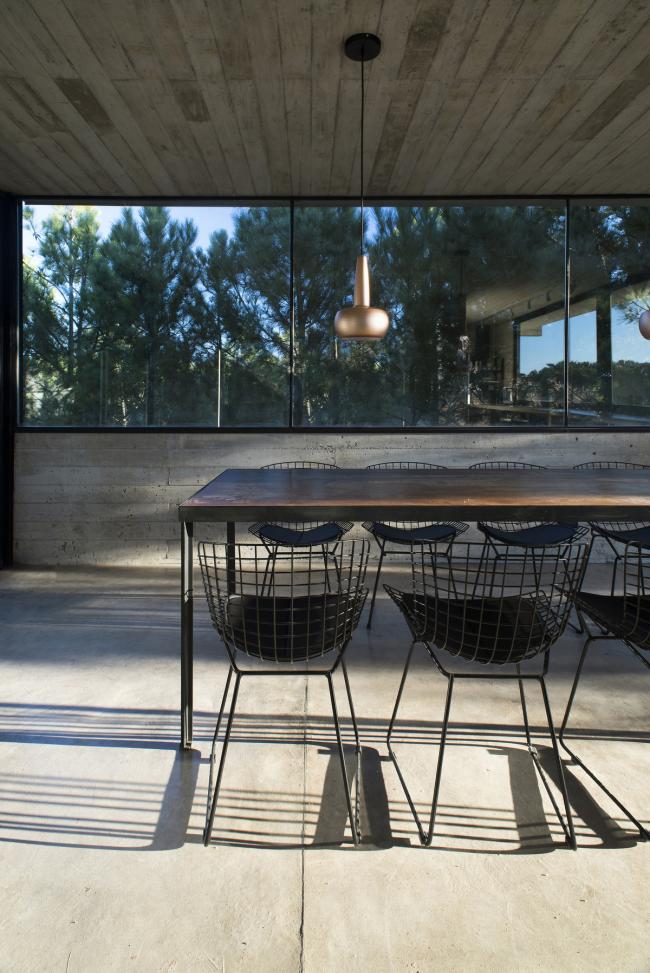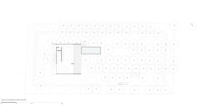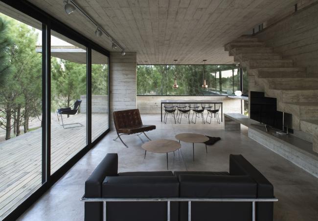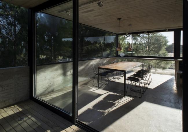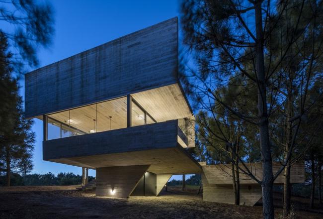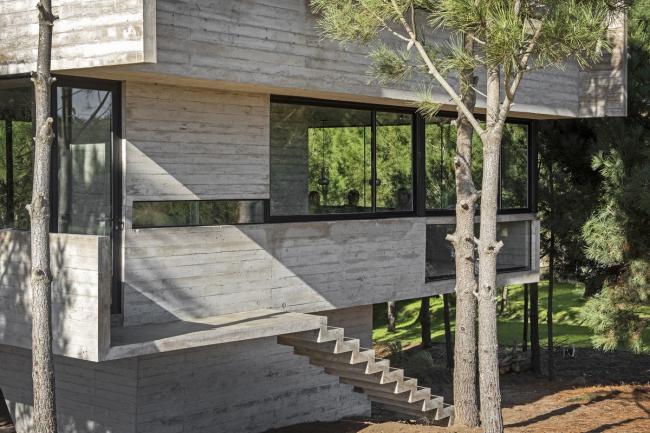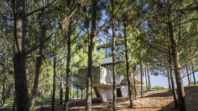 林间住宅被建在科斯塔埃斯梅拉达附近的Barrio Marítimo II地区,在皮纳马尔市北部13公里处,与布宜诺斯艾利斯市有4小时的车程。住宅与海岸平行,被海岸边的绿叶松林屏障分隔开,因此产生了遵从省级规范的妥协。场地的最高点位于前面,在远离街道时逐渐向下倾斜,就像沙丘与大海交汇时的样子。