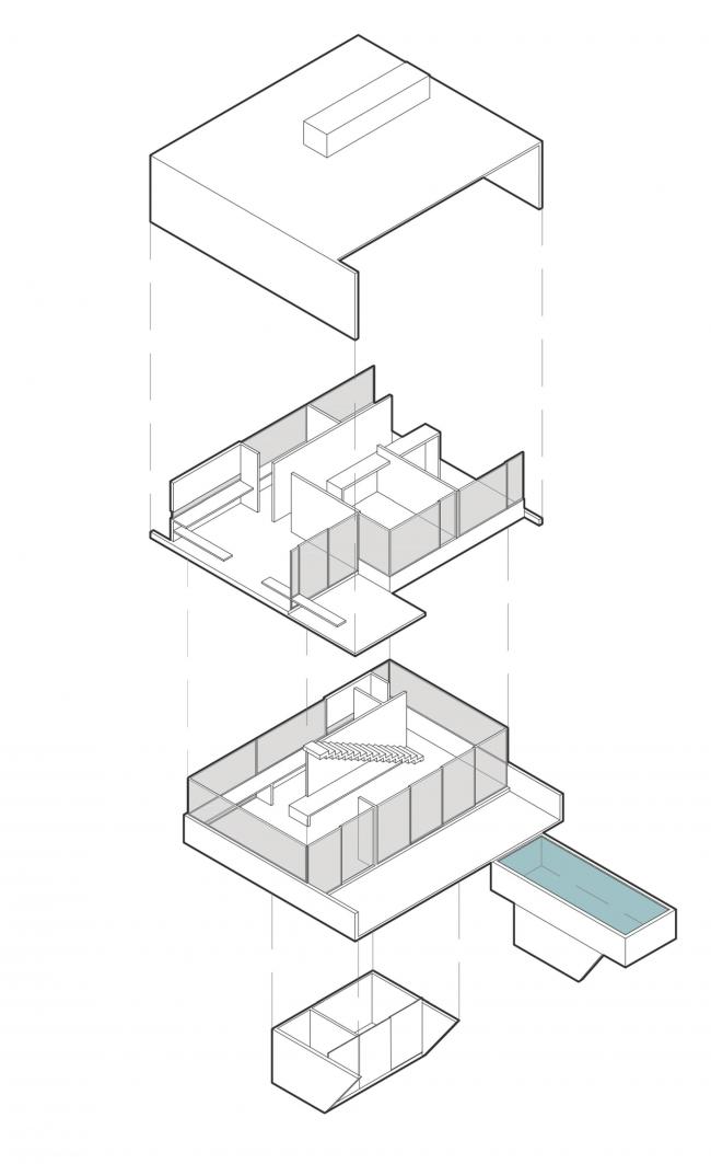 关于自然采光,优先考虑的一个目标是在楼梯间的上方屋顶开天窗。另外,两个楼层上方作为屋檐的悬挑板保护住宅正面不被来自北方垂直阳光的照射。作为一座独立的高架建筑物,游泳池脱离自然地面并通过社交区域的延伸与房屋相连。为了保持房子与植物之间的视觉连续性,游泳池被与建筑体量垂直布置。
