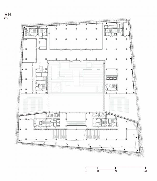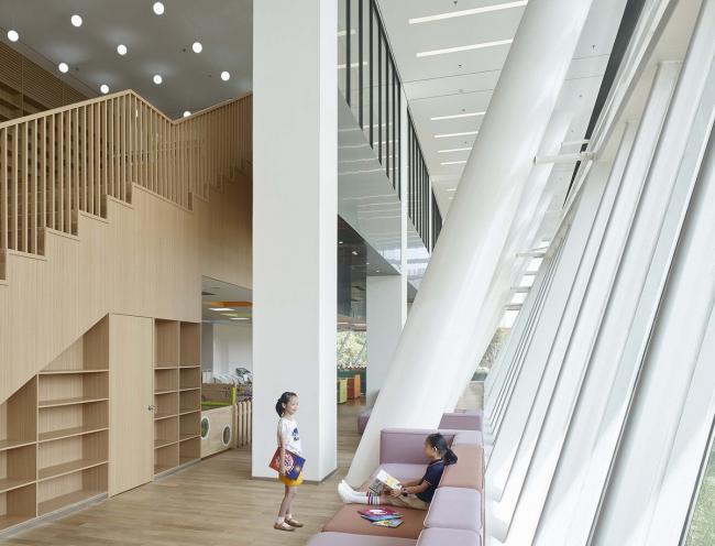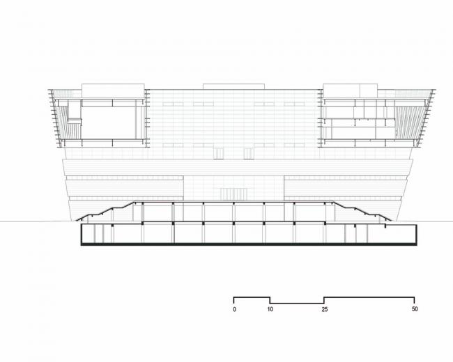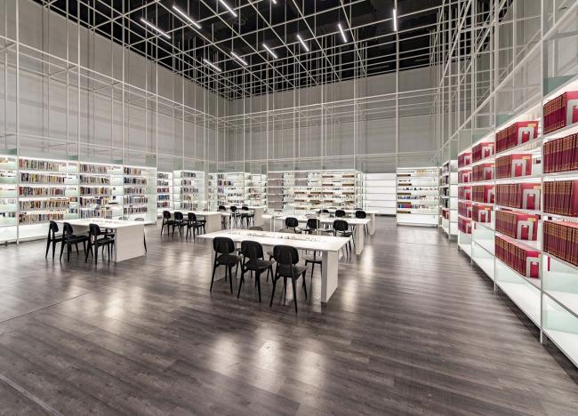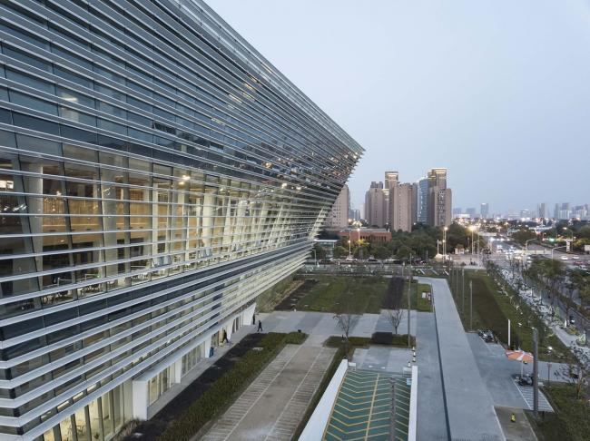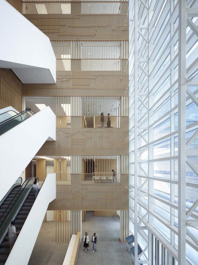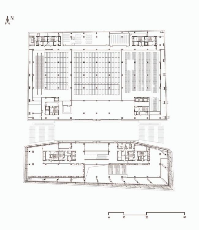 根据公共空间与书库的不同使用要求,图书馆建筑被分为两部分,它们在基座与上层空间中相互连接。书库部分厚实的外墙设计采用水平线条木纹肌理的清水混凝土,与通透的玻璃幕墙包裹的公共区域相互交叠。立面较为封闭的智能书库位于地块北侧,而采用通透立面设计的阅览室则位于南侧,朝向城市景观。地上六层建筑层高均为5.7米。