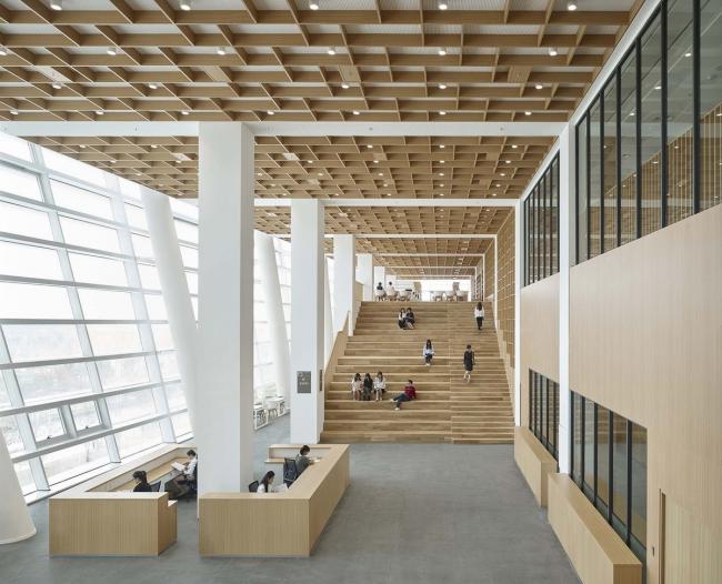 两部分建筑体量,被建筑东西方向轴线上的公共广场分隔开,图书馆主入口也位于这个被抬高的广场两侧,可经由大台阶到达广场,进入图书馆南北两区,同时可由广场到达书香公园。通过提供穿越场地的捷径,引导众多市民进入这两部分建筑,建立了建筑内外空间的功能性连接,将图书馆及其多元化的文化活动,整合到城市结构中。