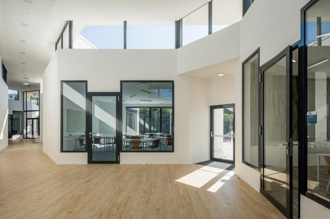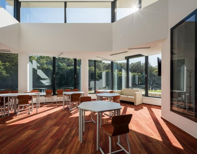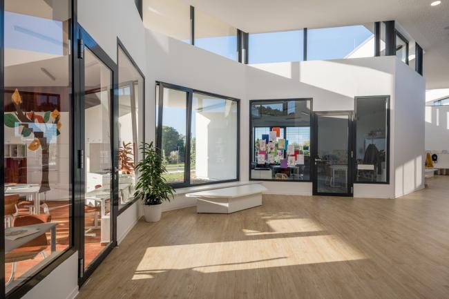 展亭式的教室的布局创造了纵向动态活跃的空间。这种结构延续到户外,通往森林方向。沿着环线创造花园空间,作为建筑和自然环境之间的过渡。