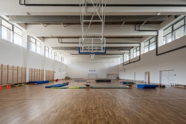 建筑体量保护了户外社交空间和运动设施。桥状的建筑结构从教室层通向篮球场。从地面往上层走,它提供了与足球场地的视觉联系。在半地下层,运动大厅被一块混凝土板覆盖着。在一层,迎面而来的是一个绿树成荫的内部花园。