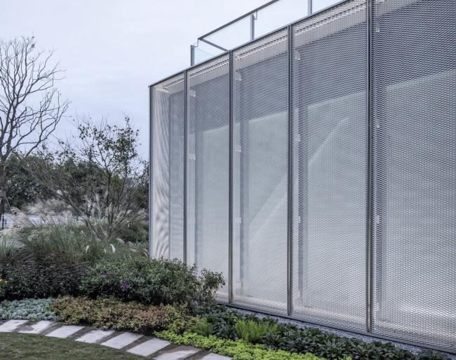 利用结构表达空间的独特内涵,是对密斯“通用空间”“流动空间”概念的延伸。环绕四周的金属拉伸网通过折角遮挡了炫光为室内空间提供私密氛围,同时又不遮挡平行光线,使室内仍保持通透。结构在拉伸网后影影绰绰,营造出内与外虚实相映的关系。