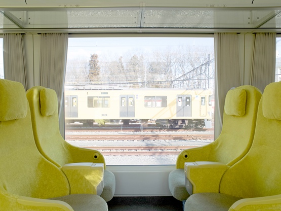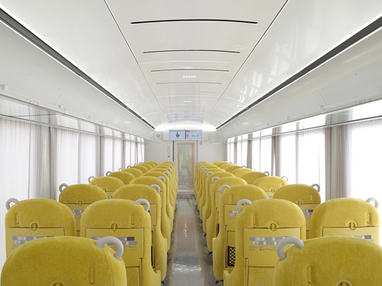 每列列车有8节车厢,共422个座位。按照妹岛和世的设计理念、车厢外部和内部都进行了设计,像沙发一样的座椅用亮黄色材料装潢。