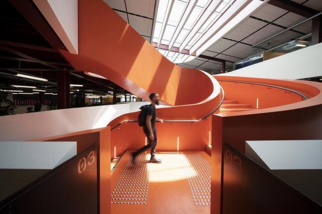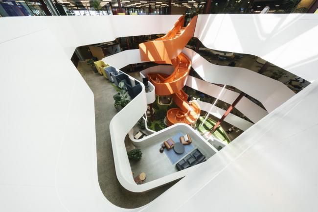 员工健康是新工作模式首要考虑的因素,将空气引入中庭促进了带有立面保温烟囱的混合通风模式的发展。中庭顶部巨大而明亮的天窗使直射的阳光渗透进建筑深处,楼梯提供了便捷的步行通道,给人提供一整天的能量。