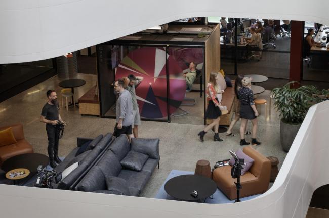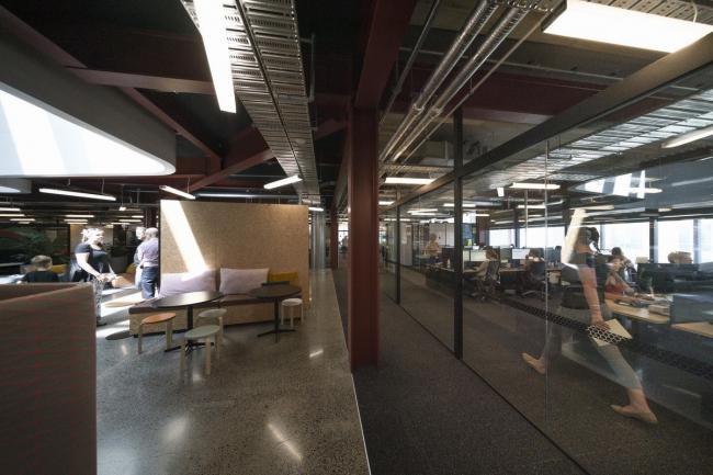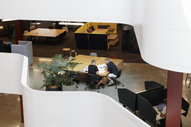 中庭是促进新的工作团体蓬勃发展的元素。连接空间的楼梯被设置在靠近入口处,鼓励人们步行于整个建筑空间而不是乘坐位于建筑边缘的电梯,从而提供约会、偶遇、注意和参与的机会。楼层的设计具有完全的灵活性,可重新定位的墙体位于边缘,创造了围绕中庭的允许更多的人和个人用户协同工作的空间。