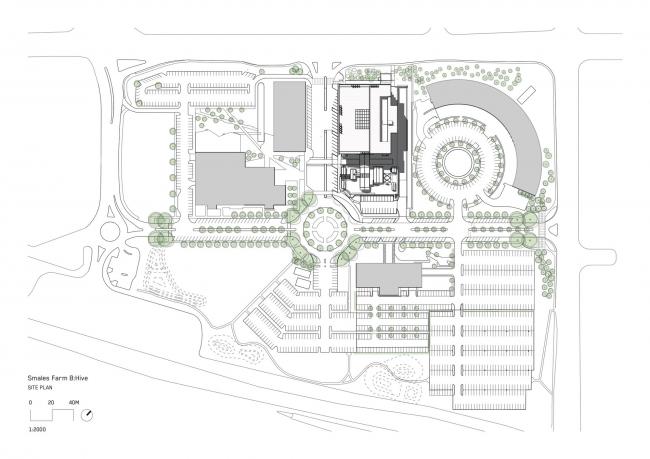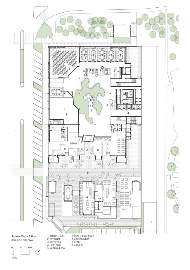 B:Hive 办公大楼的概念由 Smales Farm 构想出来,作为二十世纪的一座办公园区向二十一世纪的可占用的城市中心转变的第一步。严格来说,这是一种新的办公楼模式——实际上,它是“办公建筑”的对立面,它源于对灵活、合作和社区参与式工作“场所”的追求,吸引初创公司、小企业和个人参与其中。在 B:Hive,目前已有100家独立公司。