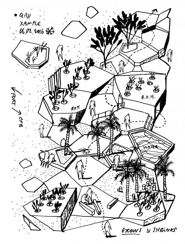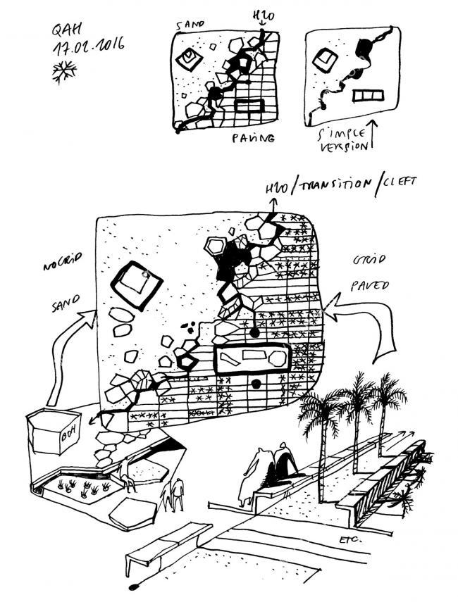总体规划通过将场地沿对角线划分为两个对比鲜明的景观来强调这种双重性。一方面,堡垒周围的平原,柔软和开放的沙漠景观将建筑塑造成独立的地标,就像现代城市迅速崛起之前一样。另一方面,在文化基金会的周围进行了铺装和功能规划,将沙漠景观与现代城市网格结构相结合。