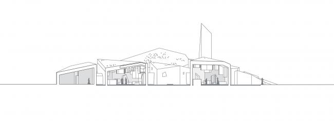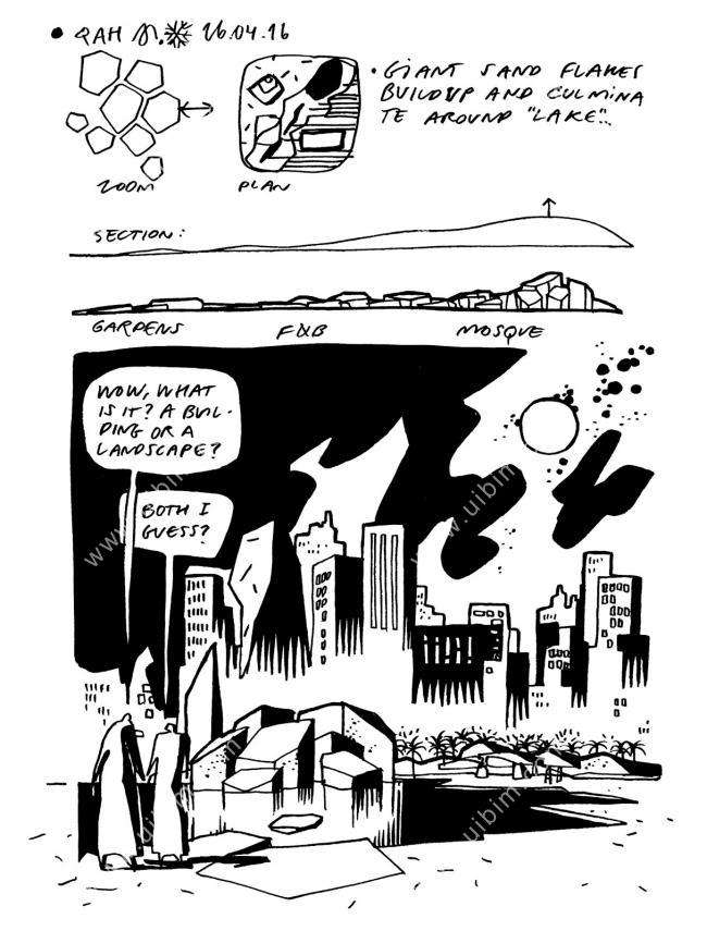 几何形状似乎有意地介入建筑和景观之间。沿着过渡区,景观由水平面变为倾斜面,并逐渐发展成实际建筑,最终形成 Al Musallah礼 拜堂。从坐柱到建筑体量,所有组成部分都与公园融为一体,成为自然景观元素,将堡垒和文化基金会作为两个主要的视觉支柱。