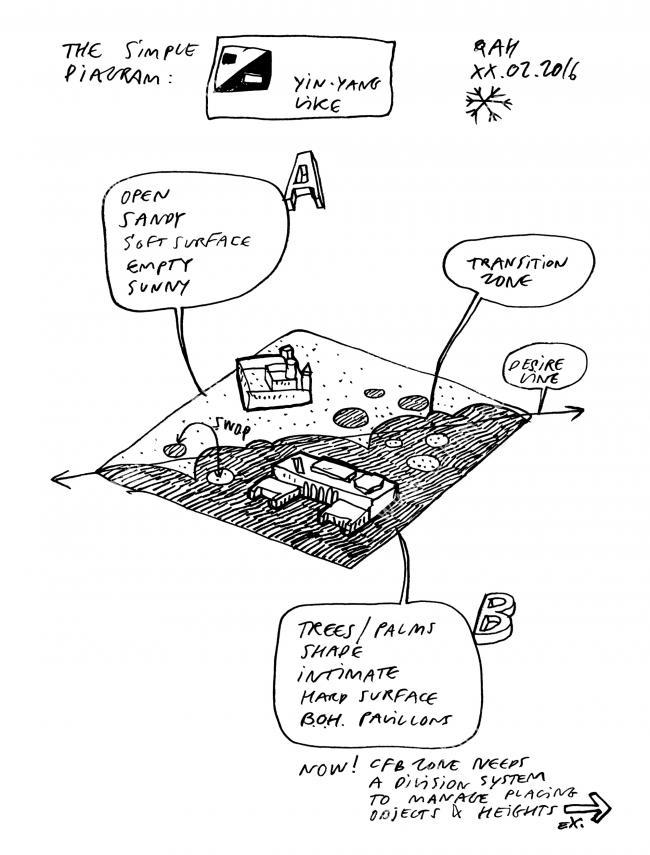 总体规划通过多样化的公共城市空间将两种类型的景观联系起来,其特点是裂缝的形成和不规则的几何形状,这些形状的灵感来自阿布扎比周围沿海沙漠景观和盐滩独特的泥裂缝模式。这些形状体现了天然沙滩和人行道之间的过渡,并作为整个场地的“设计要素”,形成了植根于原始景观的强大且可扩展的叙事线。