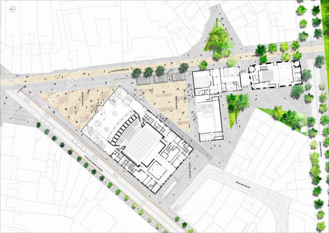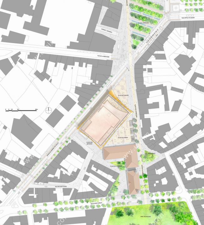剧院极简的几何外观使其能够尝试与多功能图书馆紧邻相连地矗立在戴高乐将军大道上,在“文化街巷”的一侧形成两个类似于三角形的地块。这两处公共空间作为新的城市基础设施,布局在大剧院周围:一个向历史中心开放,另一个面向居住区。