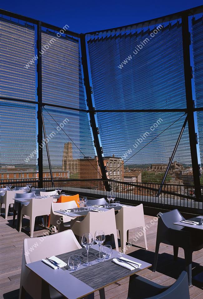 通过这个透明体,一侧通向试验厅,另一侧连接将会设置空中花园及餐厅的屋顶平台,从这个高度,人们尽可游览 Albi 城全城风貌及其周边景致。