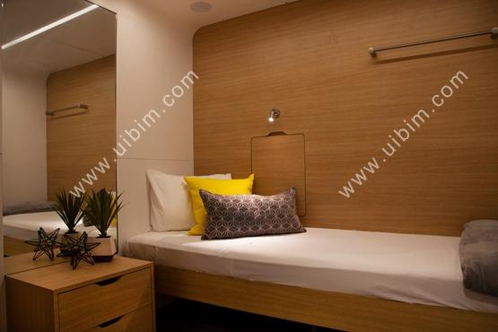 每个睡舱都有一扇可关闭的门,标准单元为45平方英尺(4平方米),紧凑型房间为35平方英尺(3.2平方米)。