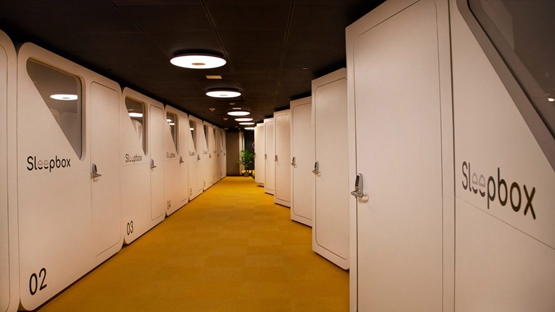 “睡箱公司”有16个可预订的小睡房,可供租用至少一小时,为旅行者提供一个私密休息的地方。